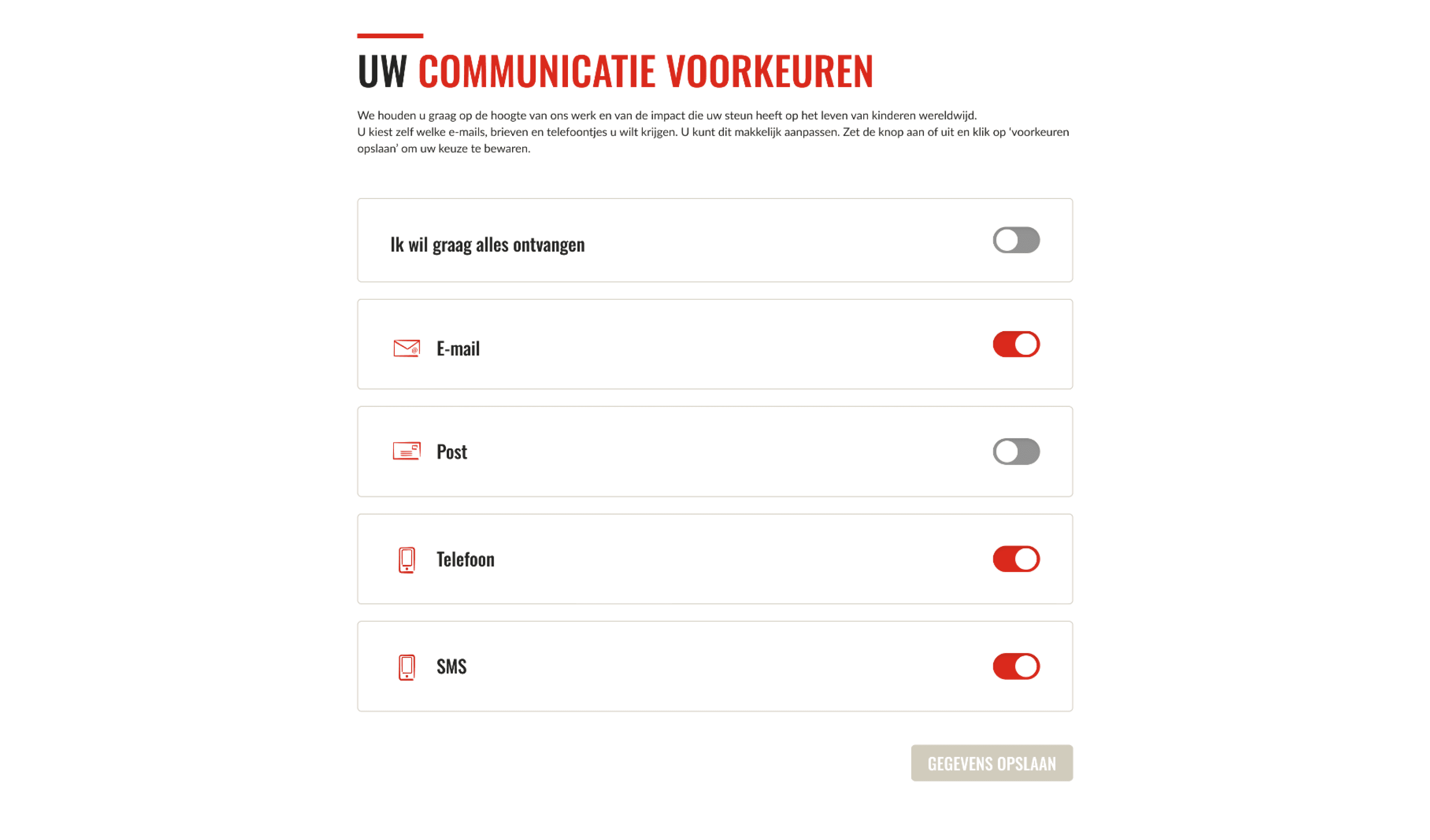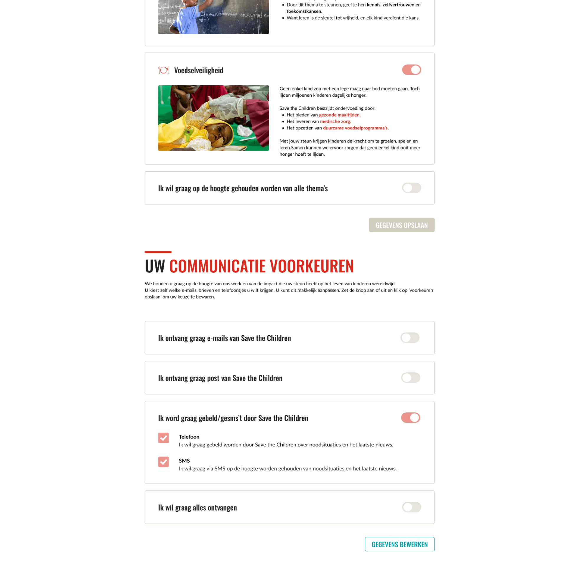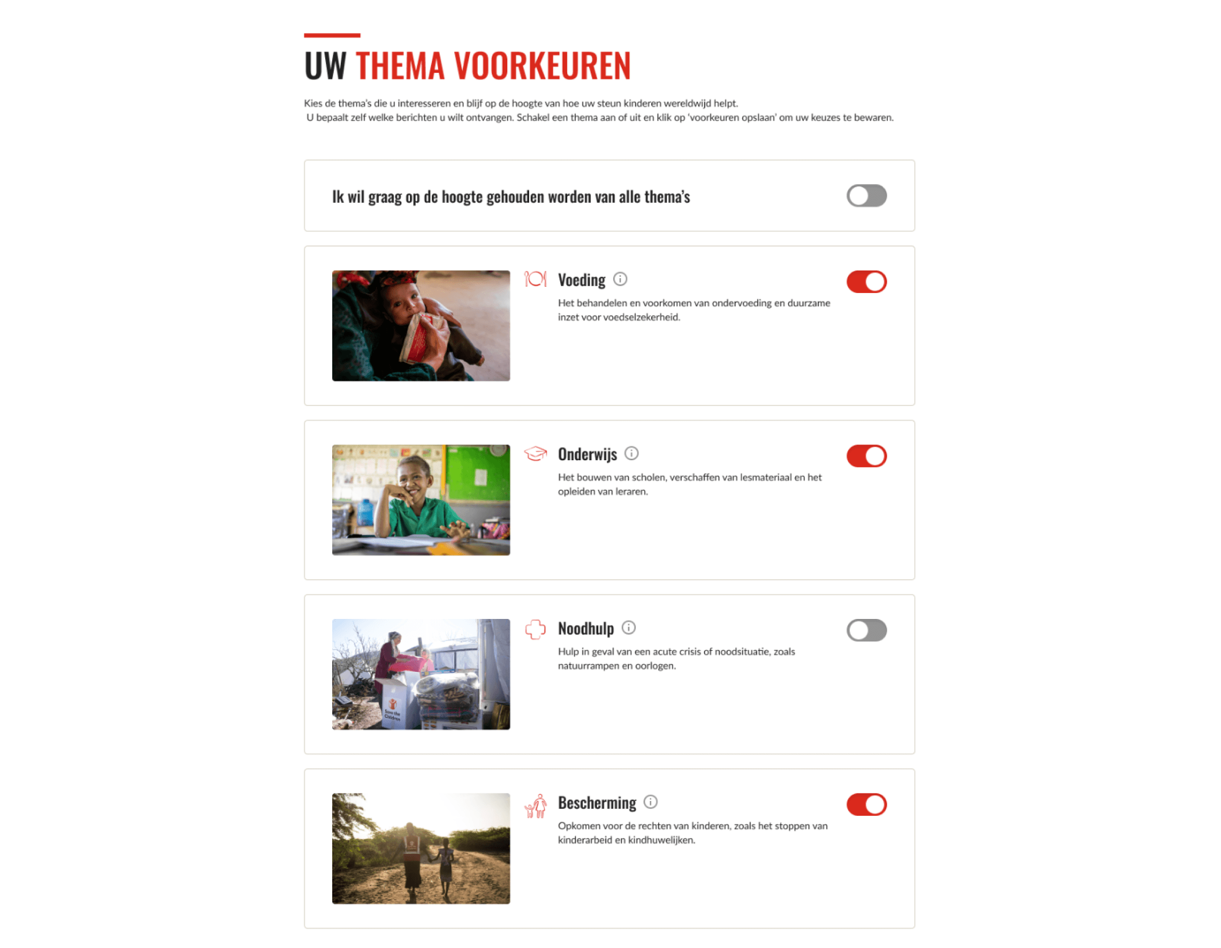 Er was geen manier voor gebruikers om hun voorkeuren door te geven. Iedereen ontving dezelfde content, ongeacht of je geïnteresseerd was in onderwijs, noodhulp of kinderrechten. Dat maakte e-mails minder relevant, waardoor (potentiële) donateurs hun betrokkenheid verliezen en mogelijk stoppen met doneren.