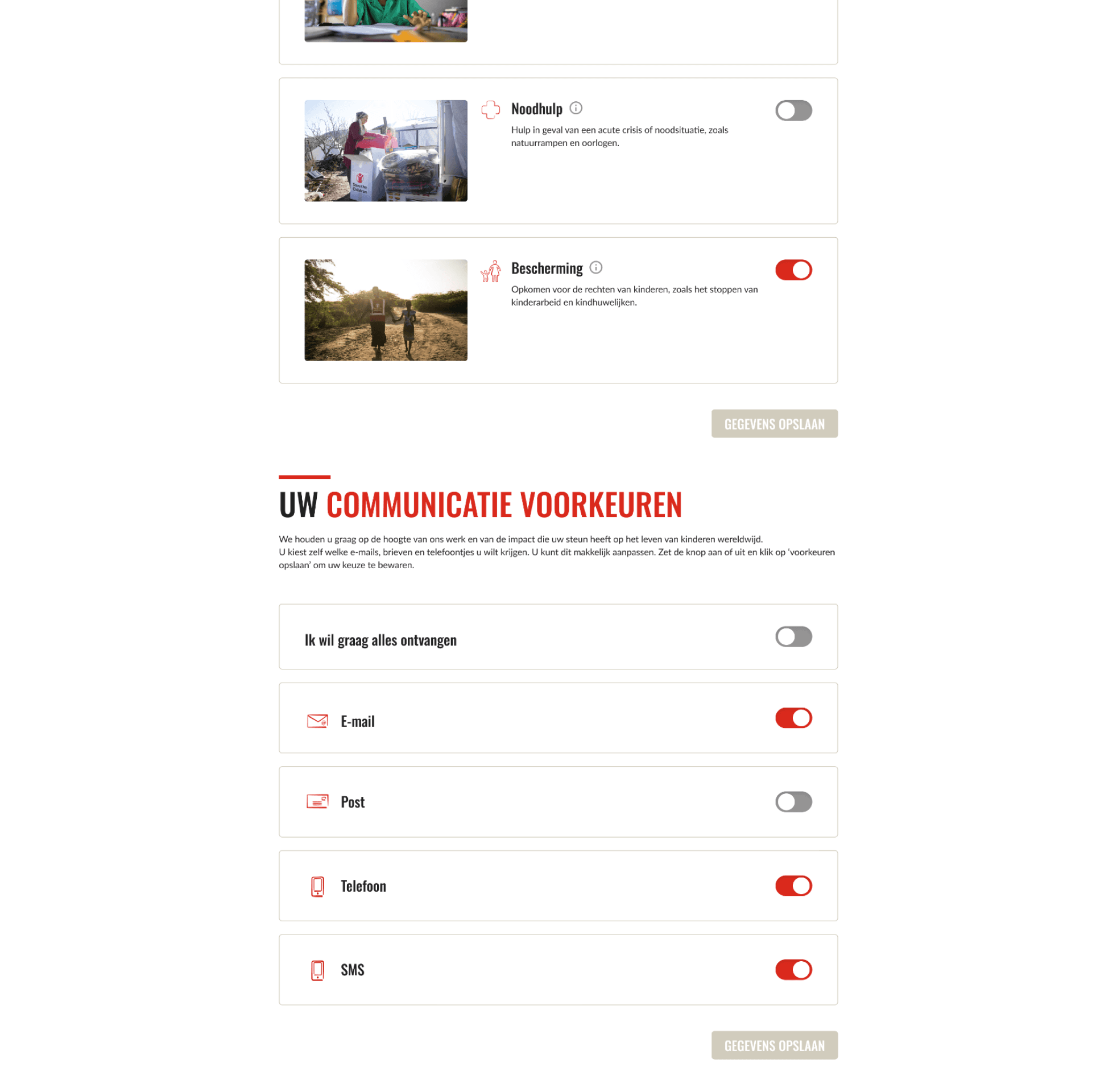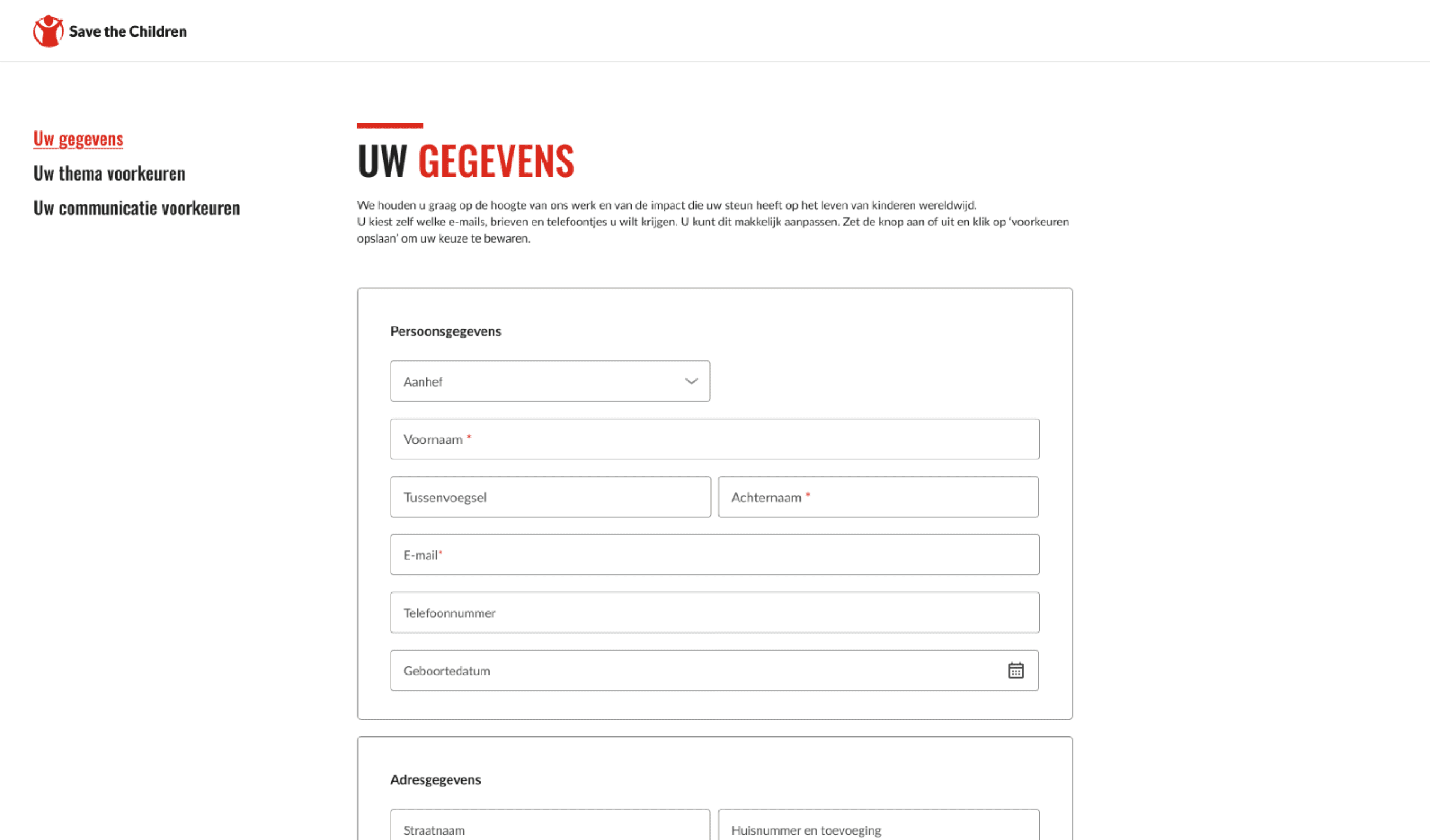 Het doel is om een manier te creëren waarop donateurs hun voorkeuren kunnen aangeven, zodat Save the Children gerichte en relevante e-mail journeys kan sturen. Het preference center moest niet alleen functioneel zijn, maar ook intuïtief en overzichtelijk, zodat het aangeven van voorkeuren laagdrempelig voelt.