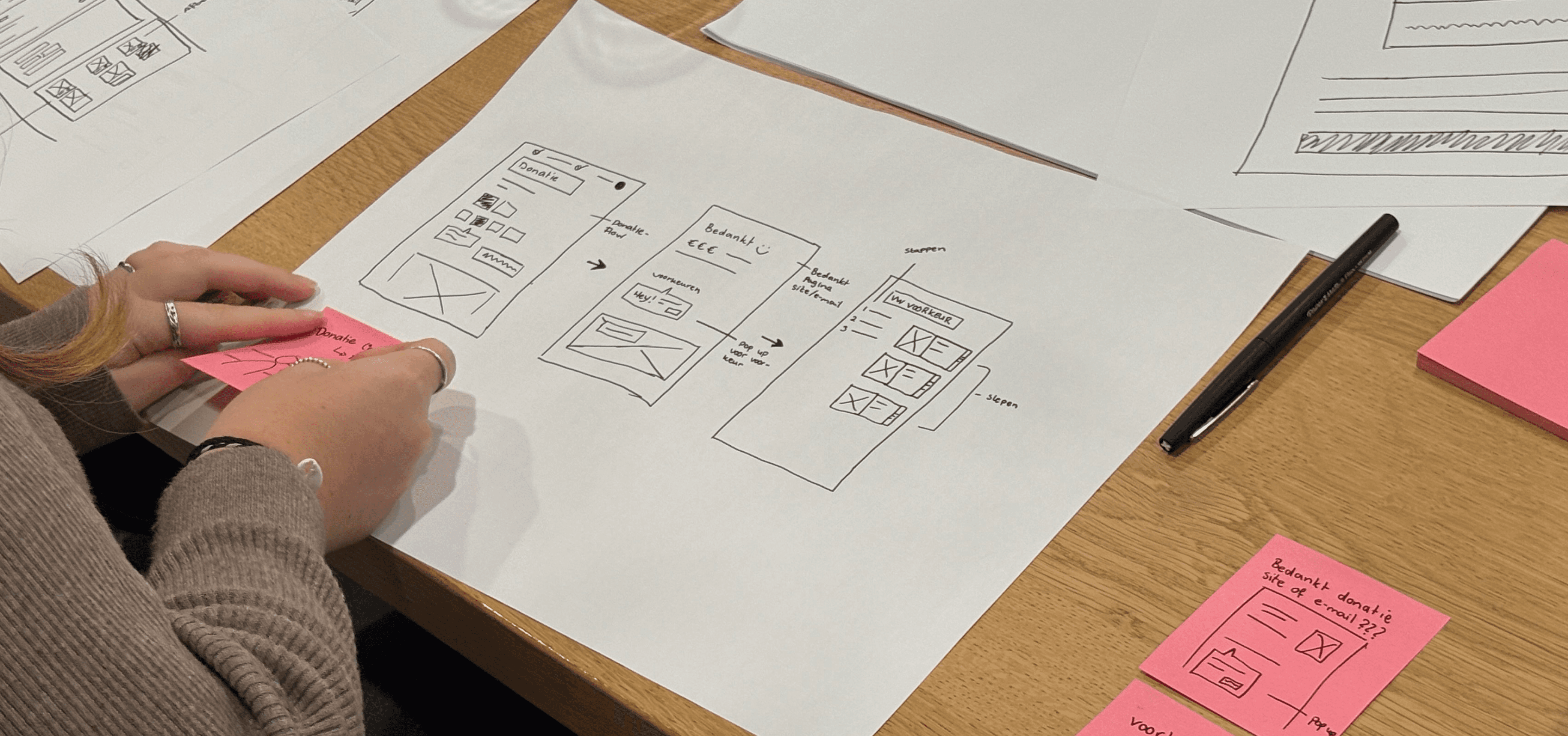 Het begon met een ideation-sessie samen met Save the Children. We brachten in kaart wat zij wilden bereiken, welke thema's belangrijk waren en hoe een preference center eruit moest zien dat aansluit bij hun donateurs. We werkten met verschillende methoden, van braindump tot Crazy 8's en storyboarding, om snel veel ideeën te genereren. Tussendoor stemden we en bespraken wat wel en niet werkte. Door samen te brainstormen inspireerden we elkaar en bouwden we voort op elkaars ideeën. Dit leverde een sterke basis op en een helder beeld van de prioriteiten en richting.